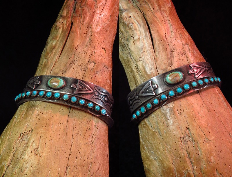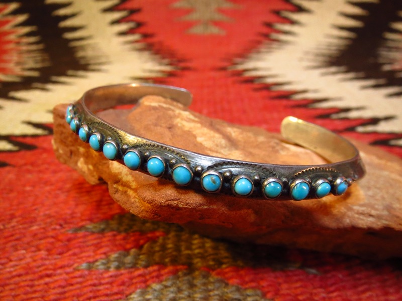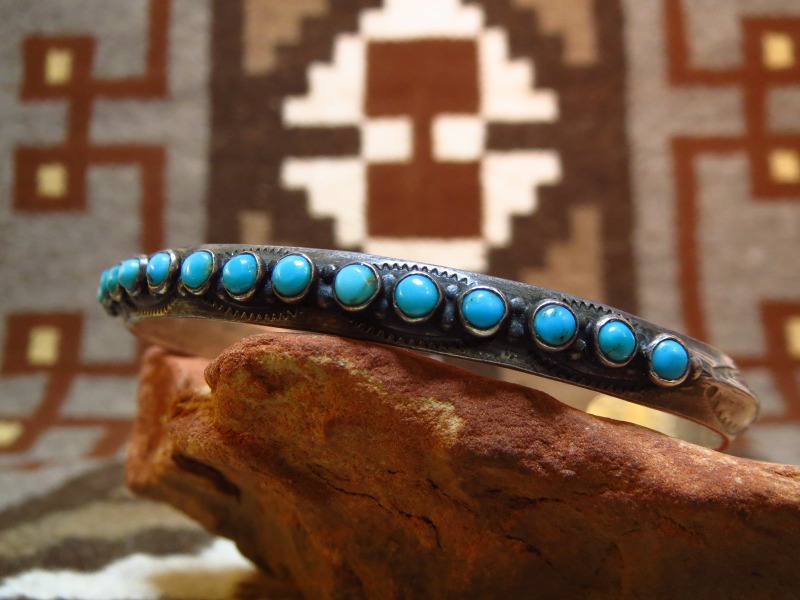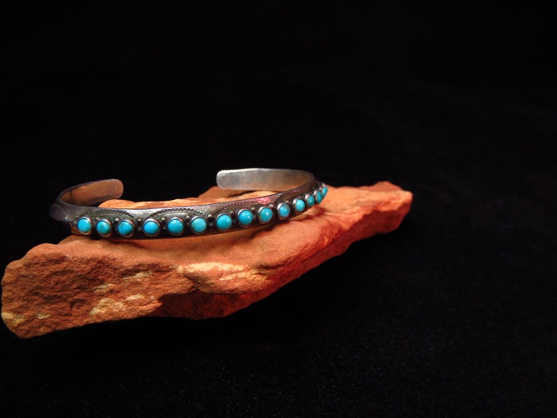 1930年代末頃~1940年代に作られたピースと思われ、おそらくインゴット(銀塊)から成形されたと思われるトライアングルワイヤーに15個ものスネークアイと呼ばれる小さなラウンドカットターコイズがセットされた作品です。ナローな作品ながら程よい重量感があり、ごく小さなシルバードロップや美しいスタンプワークも印象的なピースです。 とても小さなスネークアイターコイズをセットする作品はズニ族が得意とする技術です。そのため、こちらの作品はナバホの職人によるシルバーワークにズニの職人によってターコイズがセットされた共作かもしれません。