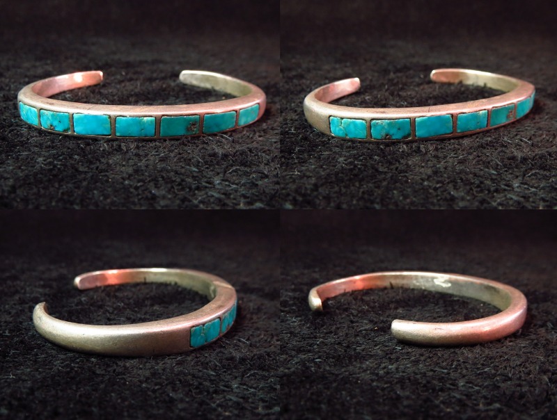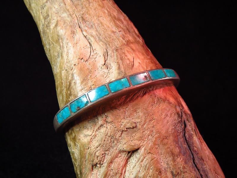 1950年代~70年代頃に作られたと思われるピースで、キャストで成形された重厚なシルバーのベースに、美しいターコイズがセットされたバングルです。ズニのビンテージ作品としては非常にオーセンティックなデザインのバングルですが、独特の雰囲気のあるピースで、ターコイズも良質なものがセットされた個体です。
