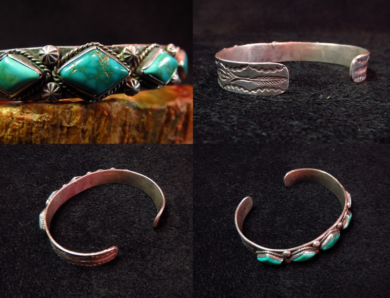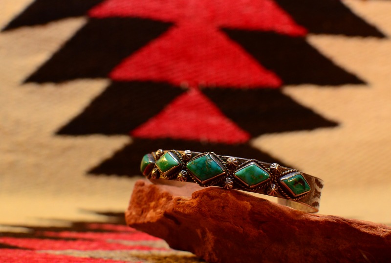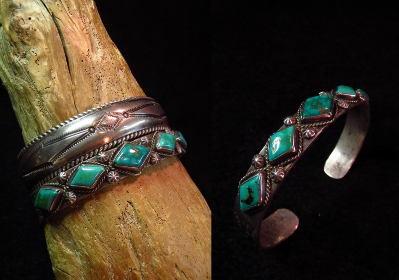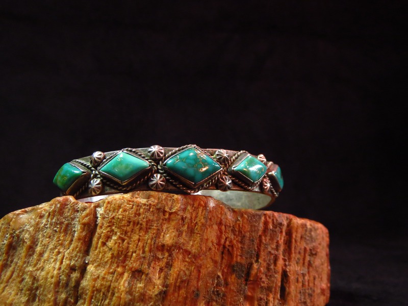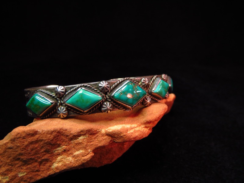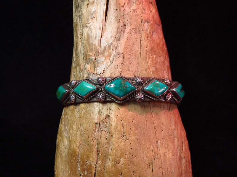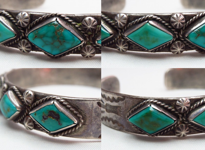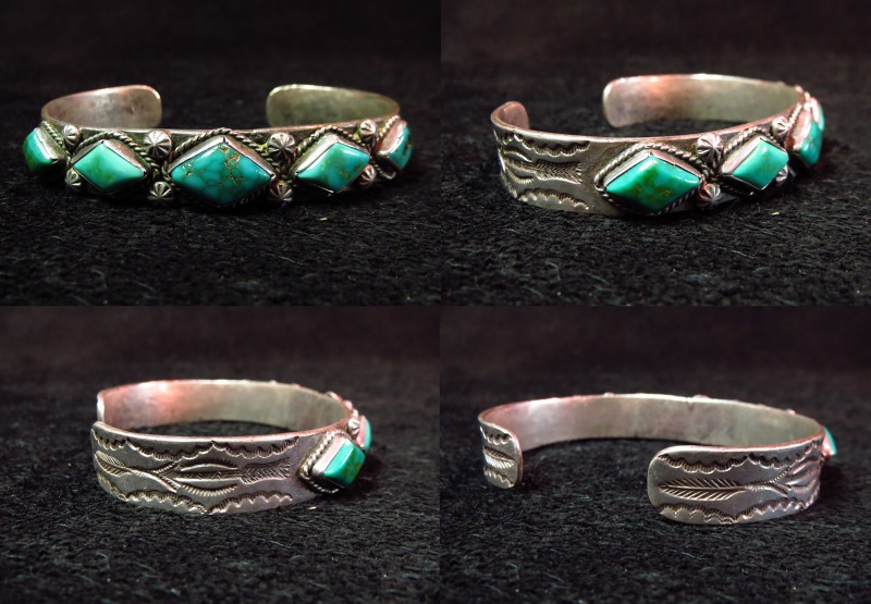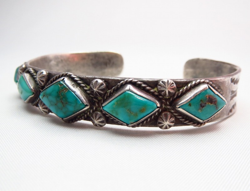 【NAVAJO】ナバホの1920年代~30年代頃に制作されたとても古い作品で、インゴットシルバーのベースにダイヤ型にカットされた美しい5つのターコイズがセットされ、武骨なスタンプワークも印象的なビンテージバングルです。