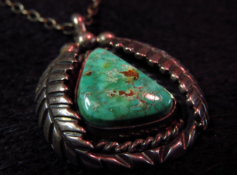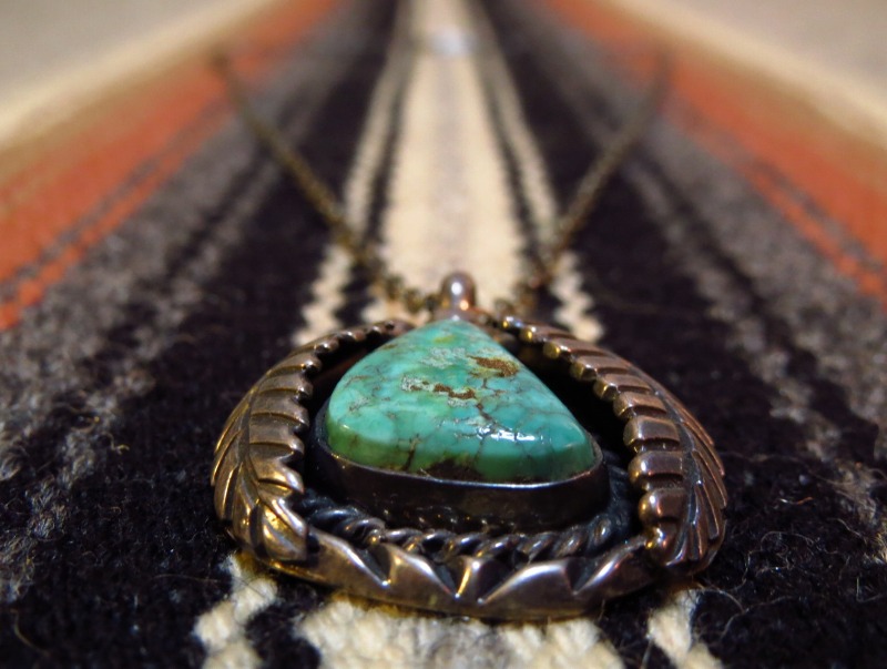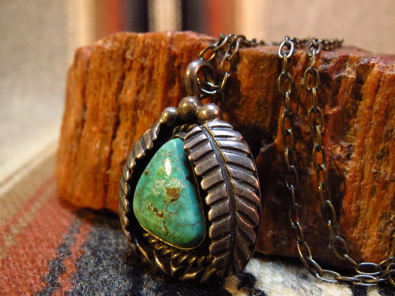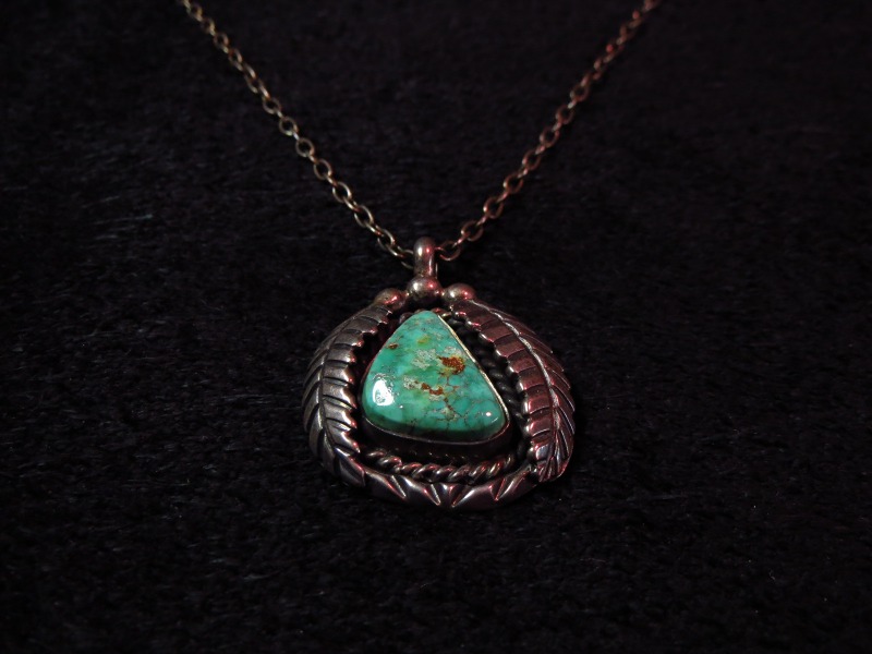 【NAVAJO】ナバホ族のOLDPAWNジュエリー、美しいグリーンターコイズとリーフ(タバコの葉)のシルバーワークが施されたビンテージネックレスです。