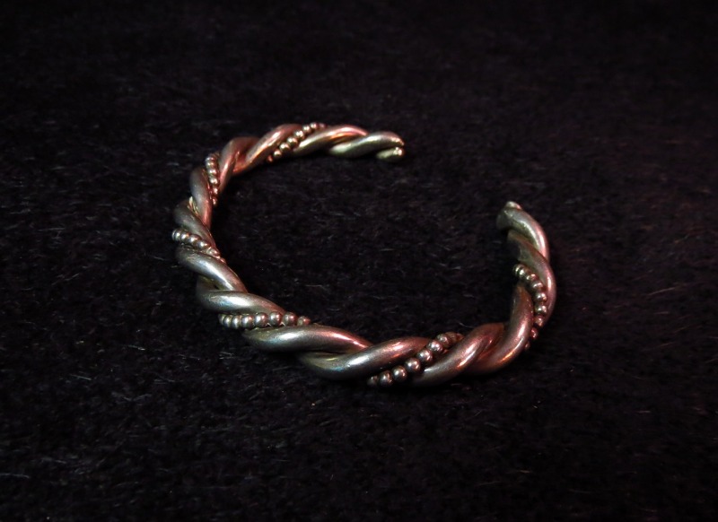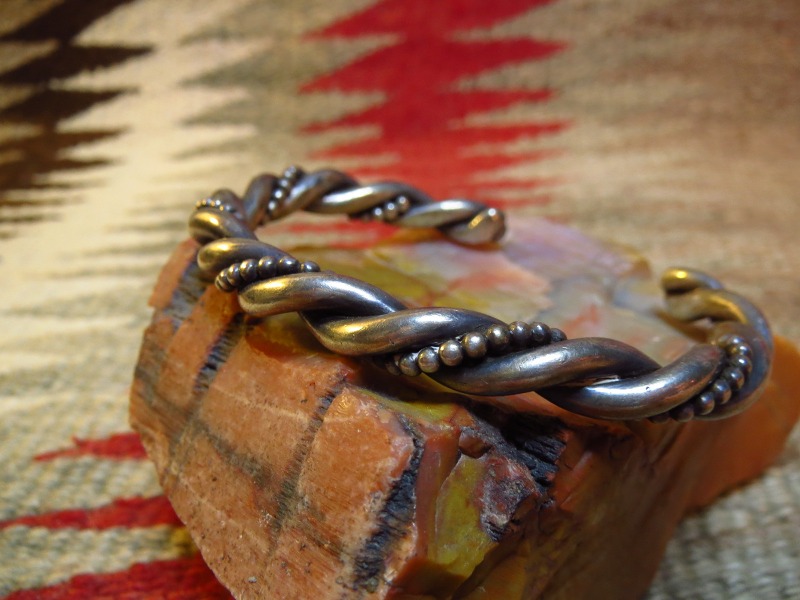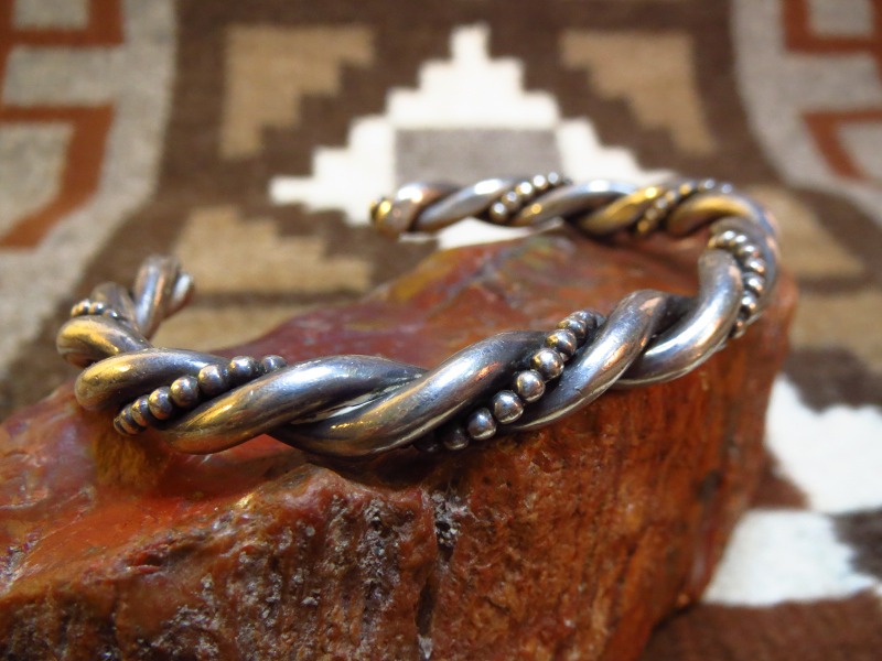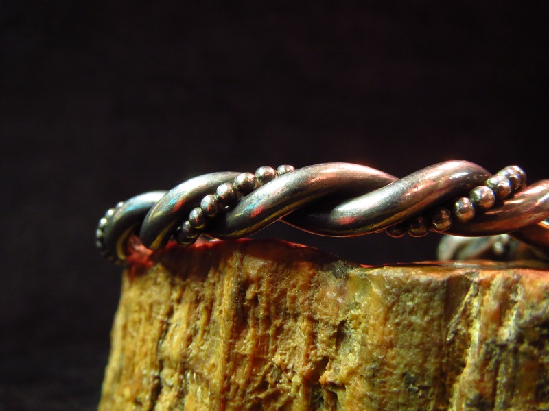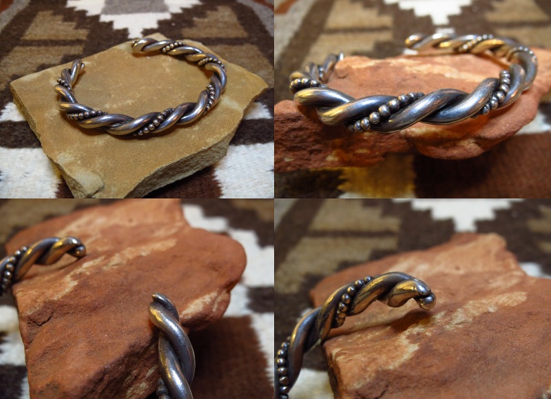 インディアンジュエリーの中でもナバホの伝統技法であるツイステッドワイヤーのシンプルな造形で、2本のシルバーワイヤーと1本のシルバーボールワイヤーがツイストされており、 ずっしりとした重厚な作りの作品です。 1970年代以降の作品と推測され、それほど古いピースではありませんが、トラディッショナルで重厚な印象は風格を感じさせるバングルです。