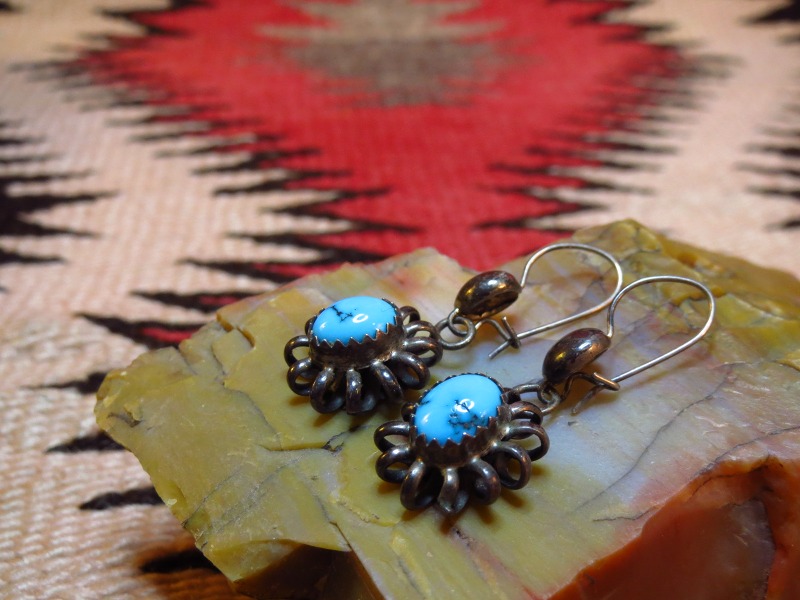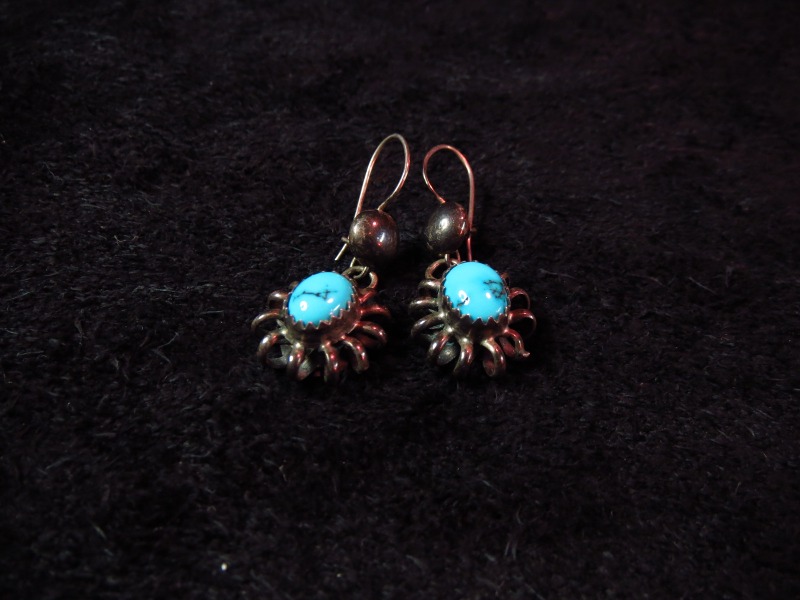 綺麗なターコイズをメインにしたデザインのピアスですが、スプリングコイル状にしたシルバーワイヤーの構造によって、ナバホの伝統的なデザインの一つであるスパイダースターのような造形を作り出しています。 また、スプリング状のシルバーワイヤーは立体的な奥行きとピアスが揺れたときの豊かな表情を与えています。