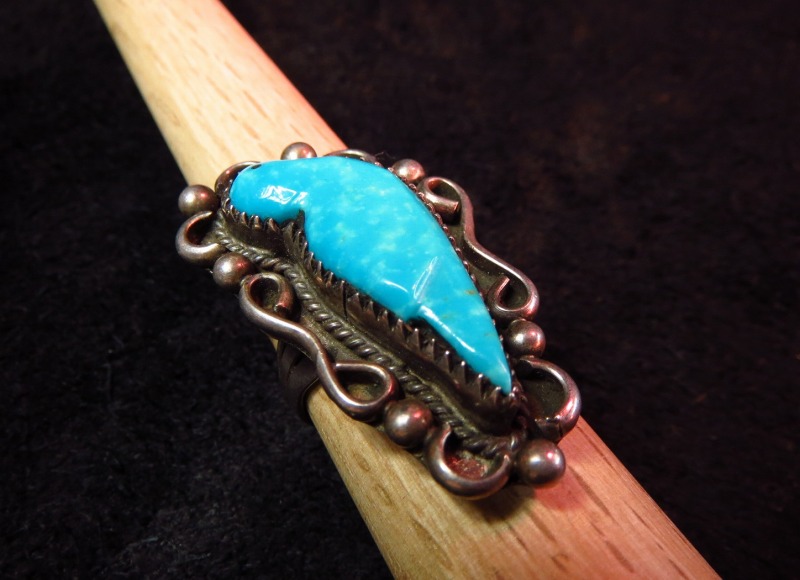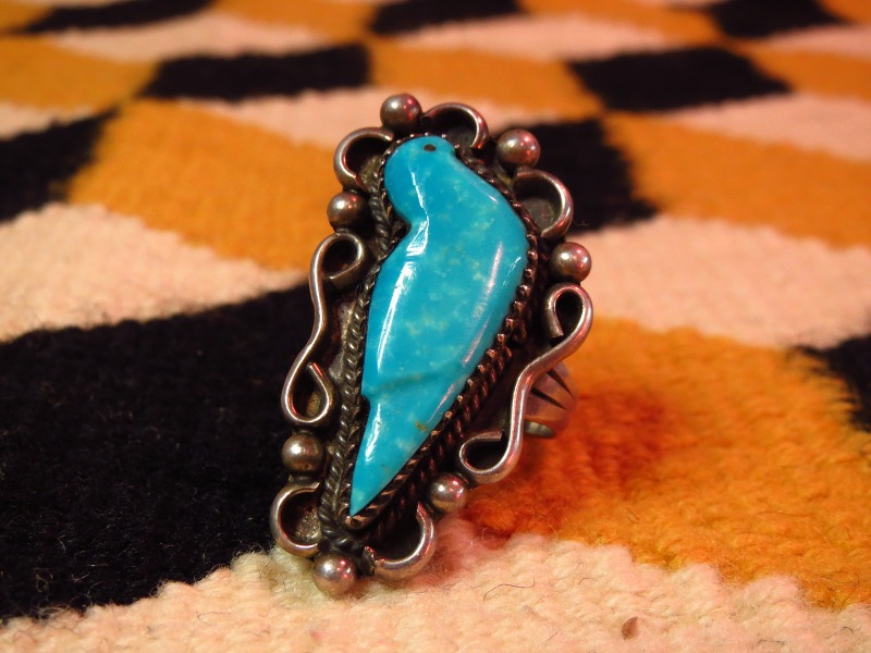 1960年代~70年代製と思われ、とても可愛い印象のターコイズカービング(フェティッシュ)の鳥がセットされ、ボリューム感のある作品です。