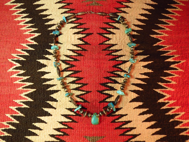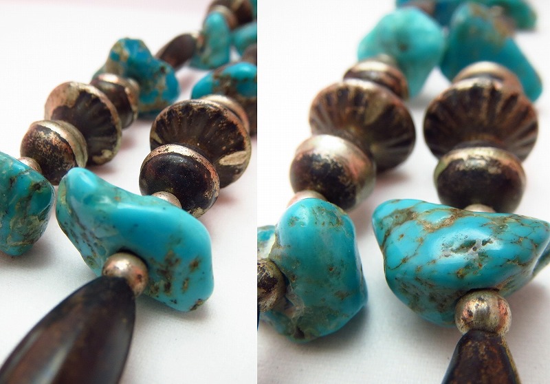 シルバービーズとターコイズビーズを使ったネックレス、黒くなったシルバーと美しいターコイズカラーのコントラストが印象的な作品です。