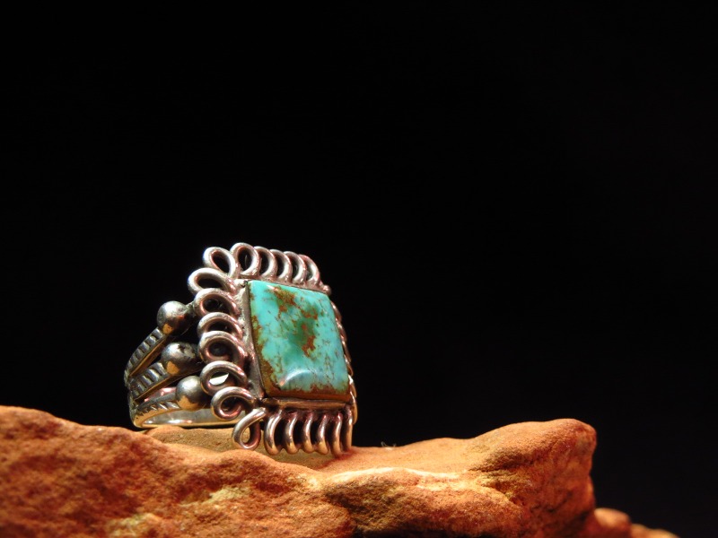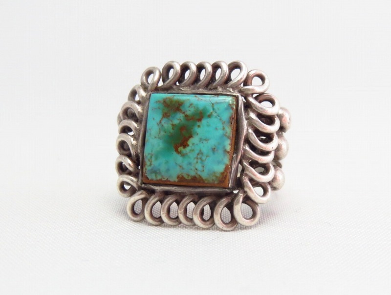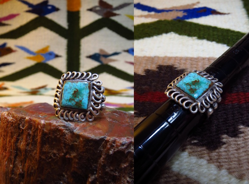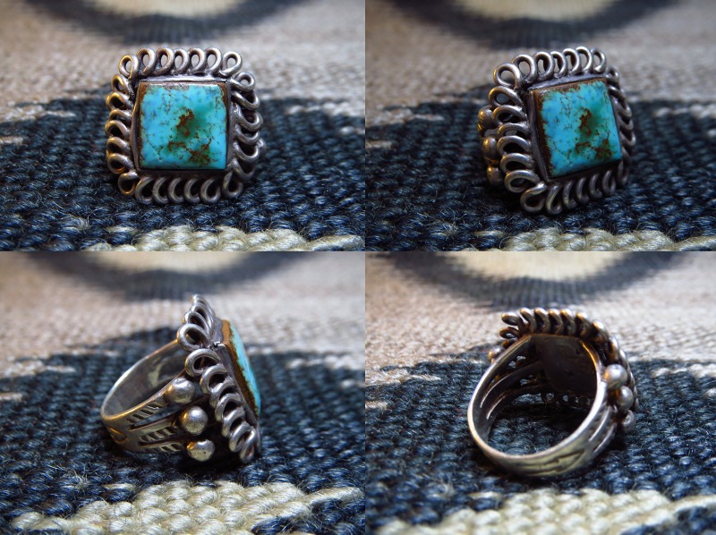 とてもオーセンティックなスプリットシャンクに、スクエアカットターコイズがセットされており、独特のベゼルはコイル状のシルバーワイヤーを平たく叩いたものが施され、プリミティブでハンドメイドの味わいを感じさせるデザイン/造形の作品です。