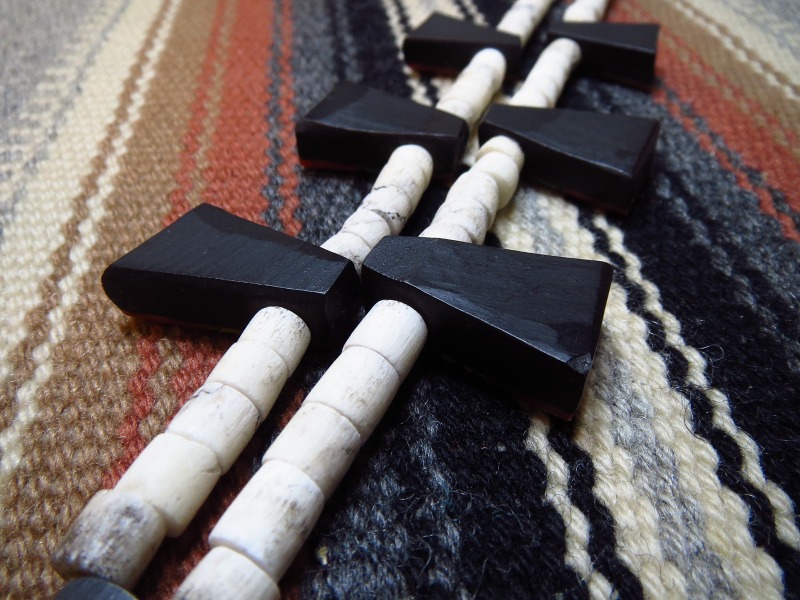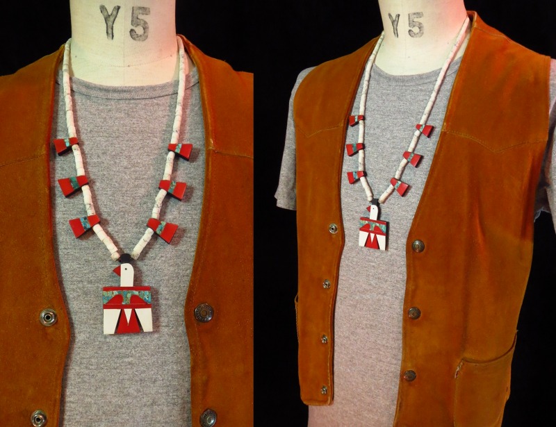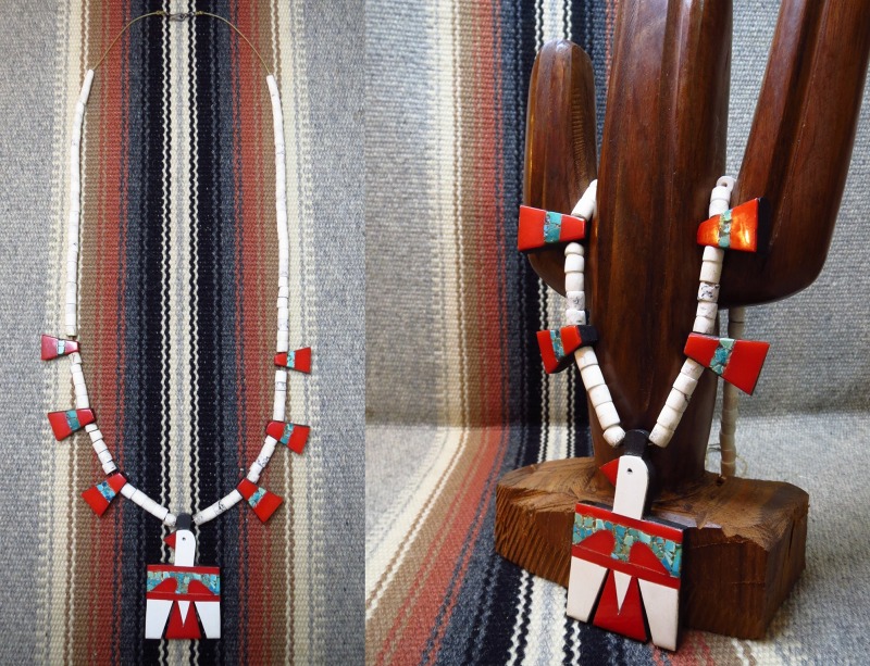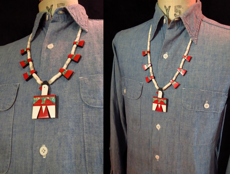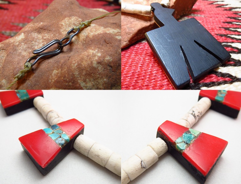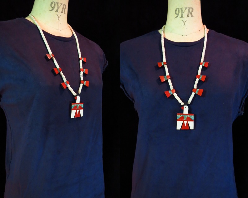 アンティーク独特の味わいを持つネックレスです。作品単独では派手な印象ですが、多くのスタイルに馴染みやすく、ナバホやホピ、ズニのジュエリーとも相性の良い作品。性別を問わずお使いいただけます。