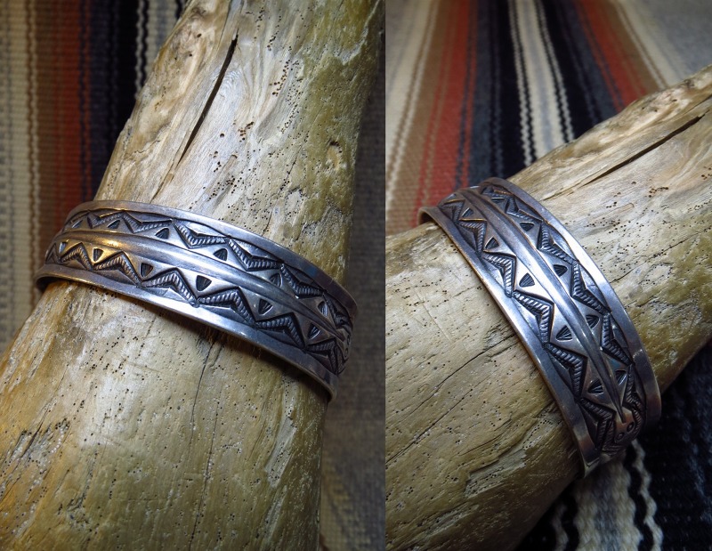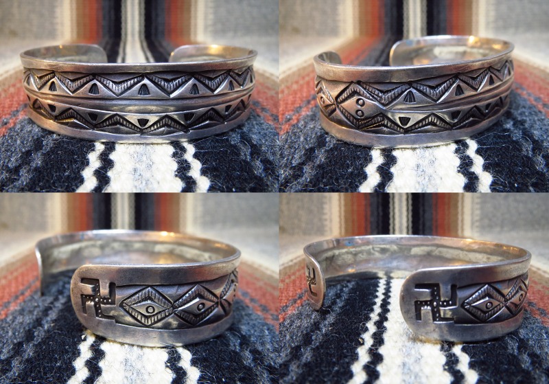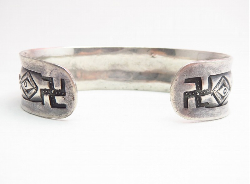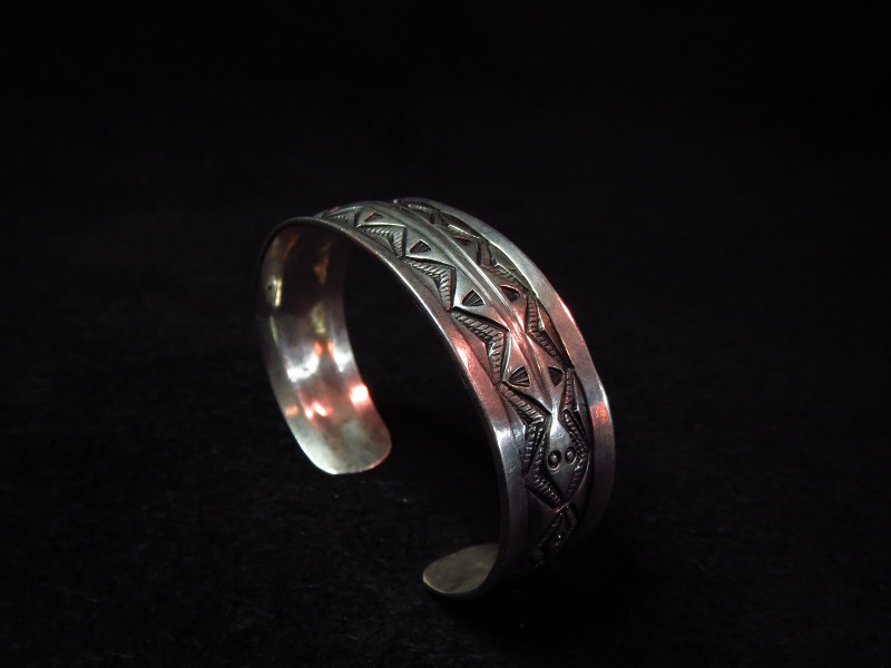 【NAVAJO】ナバホのアンティークジュエリー、1900年代後半~1910年代製と思われる古典期に近い時期の作品で、ハンマーワーク・スタンプワーク等の伝統的な技術によって構成されていますが、非常に高い技術に裏付けられた独特の立体的なシェイプに造形された素晴らしいクオリティーのアンティーク/ビンテージバングルです。