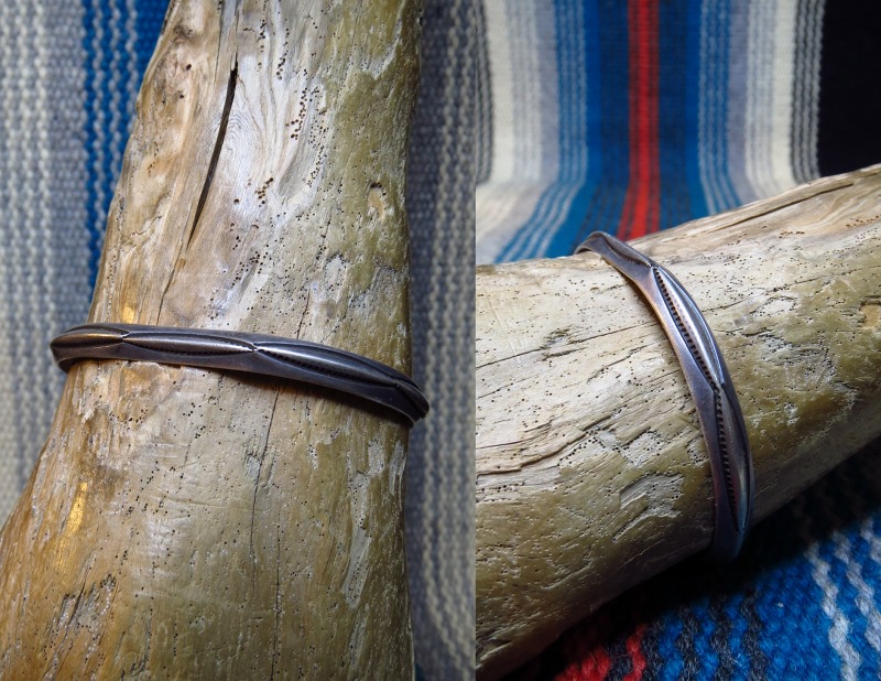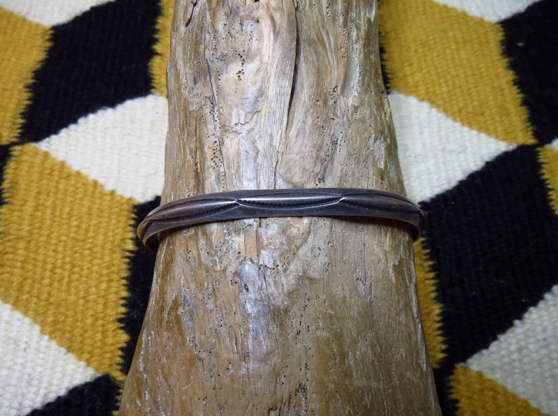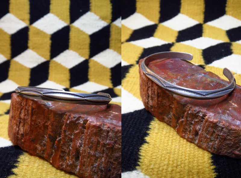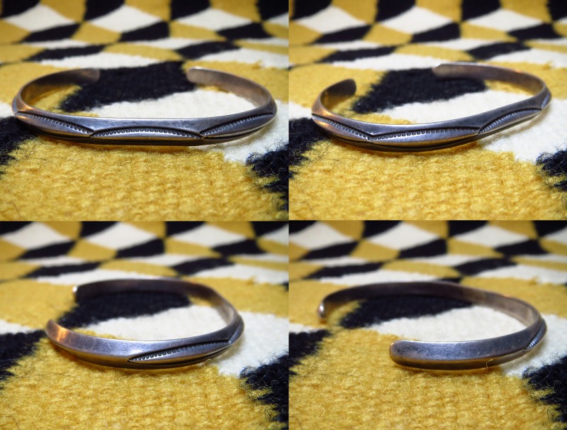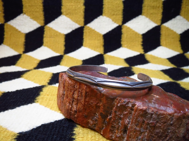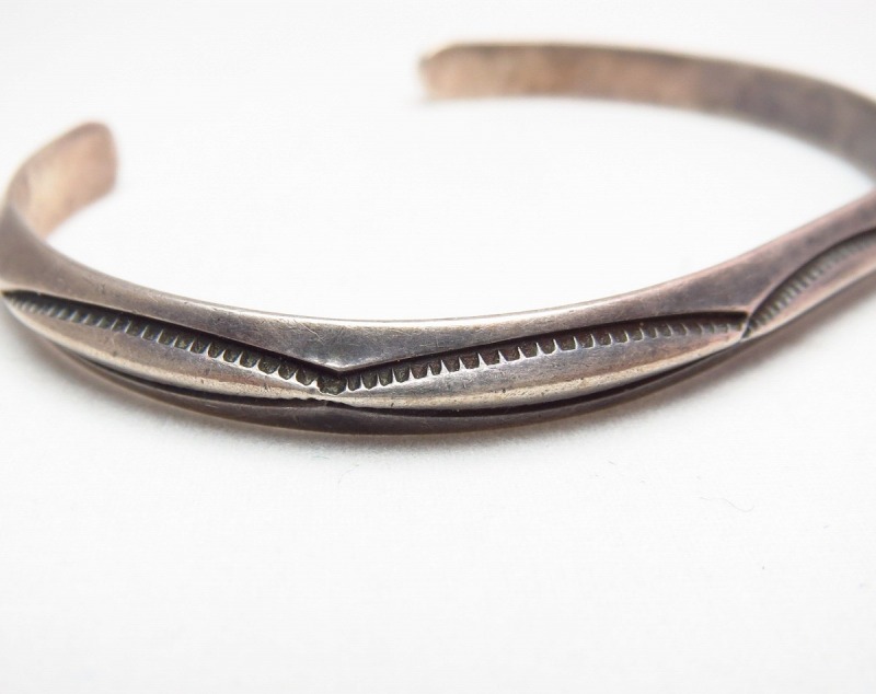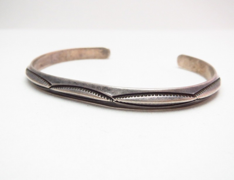 【NAVAJO】ナバホ族のビンテージジュエリー、オーセンティックなトライアングル(竜骨型)ワイヤーに大変シンプルなベイナースタンプが力強く施されたOLDPAWN/ビンテージバングルです。